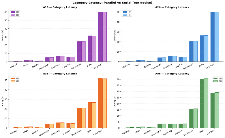 We tested gemma-3-270m-it-int8 via MediaPipe CPU backend on the Galaxy A16, A26, A36, and A56, measuring latency, token throughput, memory, and accuracy across 25 prompts. We also compared parallel (all 4 devices simultaneously) vs serial (each device independently, 2 runs) execution to verify whether concurrent operation affects results.