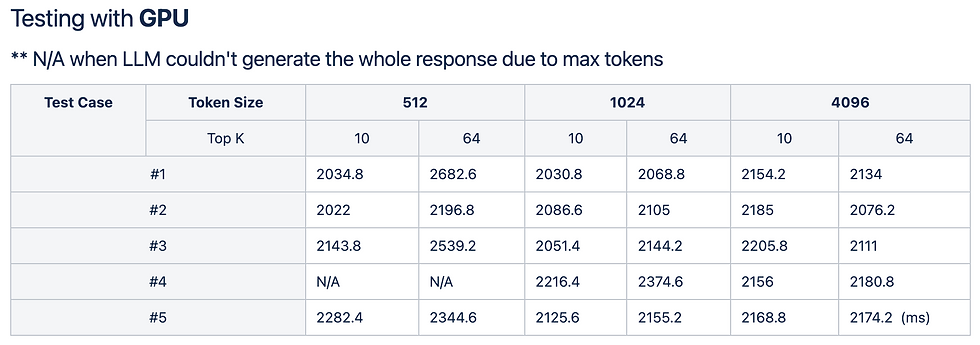 - In the GPU environment, processing speed improved. However, we discovered a critical edge case: due to hardware resource allocation limits, the LLM frequently failed to generate the entire response (e.g., throwing "N/A" results or Out of Memory errors) when hitting the allocated max_tokens limit. This is a typical challenge faced when running LLMs within restricted mobile resources.
