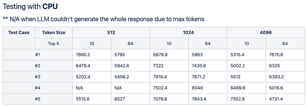 - In the CPU environment, we experienced a long initial delay of several seconds (5000~7800ms) before the question was processed and token generation began.